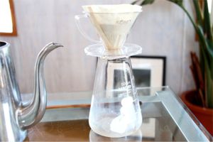 6.ゆっくりと抽出。 サーバーの氷も、溶けていきます。 1人前=120から140ccが目安です。 抽出ができましたら、ペーパー内にお湯がたっぷりと 残っている状態で、サーバーからはずします。 ペーパー内のお湯をすべて落としてしまうと、アクまで 抽出されてしまいますので、ご注意ください。 |
