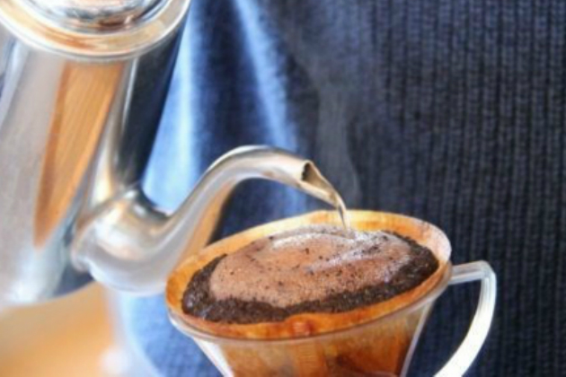 3.サーバー内のお湯を、コーヒーカップなどに移します。(コーヒーカップが温まります) 抽出開始。 少量のお湯を注いで、すこし蒸らします。 このとき、ペーパーにお湯がかからないようにしてください。 また、ここから抽出ポットのお湯は、温めなおさないようにしてください。 |